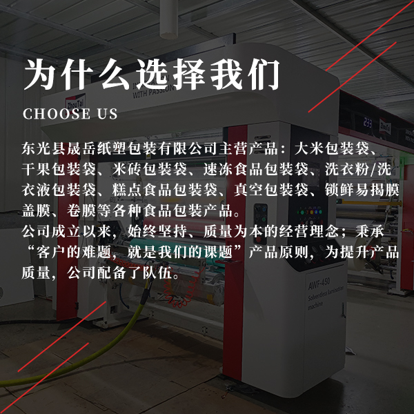 東光縣晟岳紙塑包裝有限公司主營產品:大米包裝袋、干果包裝袋、米磚包裝袋、速凍食品包裝袋、洗衣粉/洗衣液包裝袋、糕點食品包裝袋、真空包裝袋、鎖鮮易揭膜蓋膜、卷膜等各種食品包裝產品。